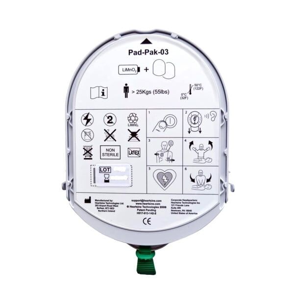 One set of adult electrode pads and one battery pack for the HeartSine Samaritan 300P/350P/450P. HeartSine has taken an innovative approach to maintenance items by incorporating the AED batteries and electrodes into one single-use cartridge called the Pad-Pak. The advantage to the Pad-Pak is that there is only one date to monitor and only one item to replace on expiration or after use. Each Pad-Pak has an industry-first four-year life, and provides 60 shocks or six hours of continuous monitoring. When battery power is down to 10 shocks or less, the HeartSine samaritan PAD emits an audible prompt. The samaritan PAD’s built-in intelligence and unique Pediatric Pad-Pak ensures the appropriate energy level is delivered for children.